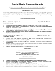 Use the following sample resume for a social media manager as a guide. November 9, 2017 | by lauren mcadams. We use the word 'resume' but in our industry, that can mean many things. Land your dream job in social media: A dynamic, motivated, social media marketing specialist with the educational background and now that you've seen an example of a job winning social media marketing specialist resume, here are.